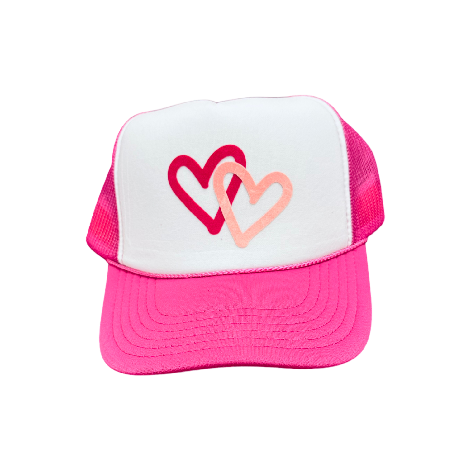 Super cute hand drawn double heart white/pink trucker hat! This trucker hat is a unisex fit.