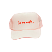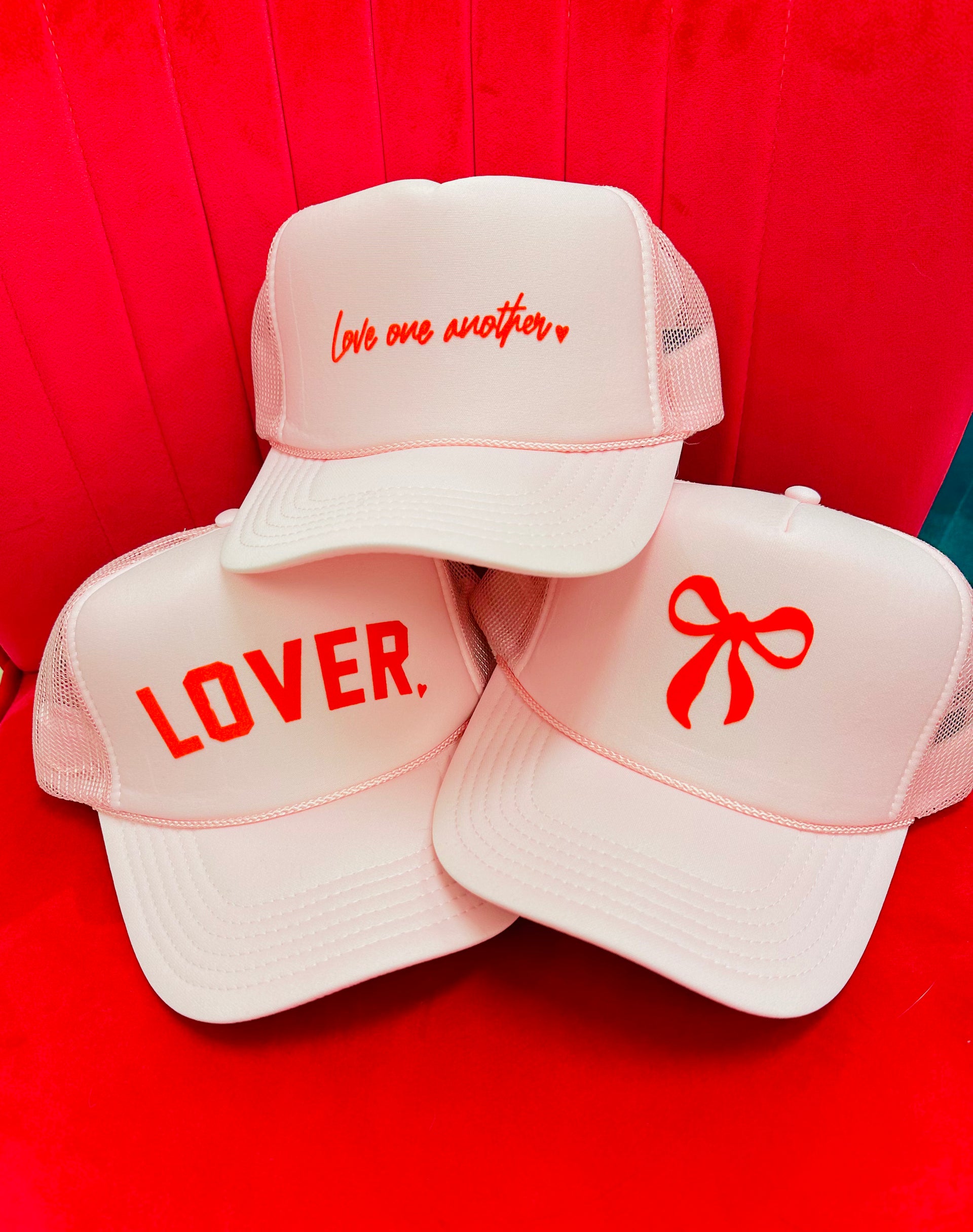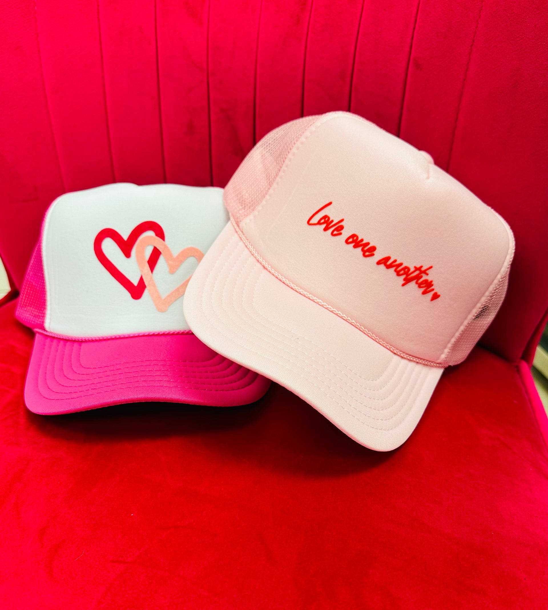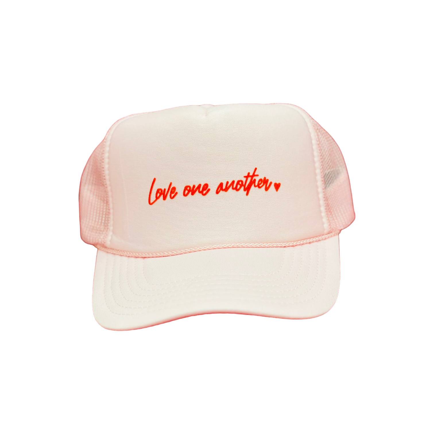 Super cute 'Love One Another' light pink trucker hat! This trucker hat is a unisex fit.
