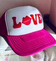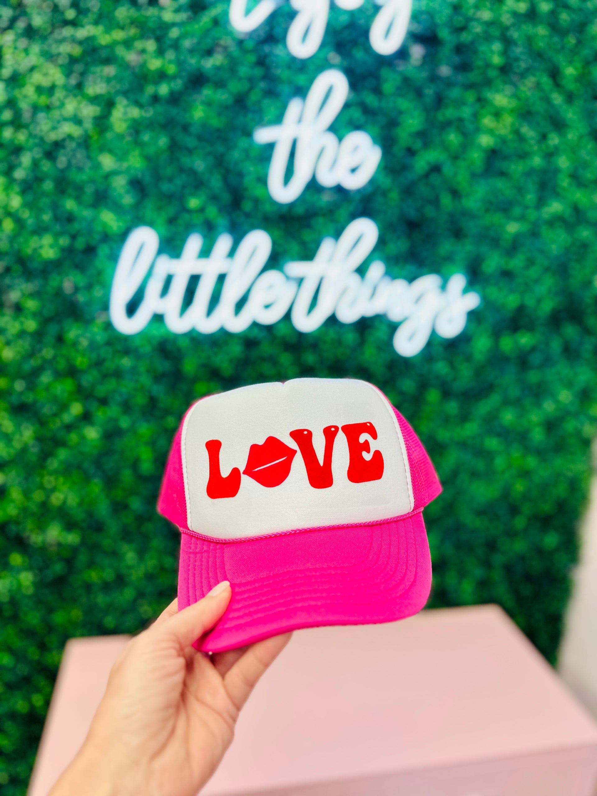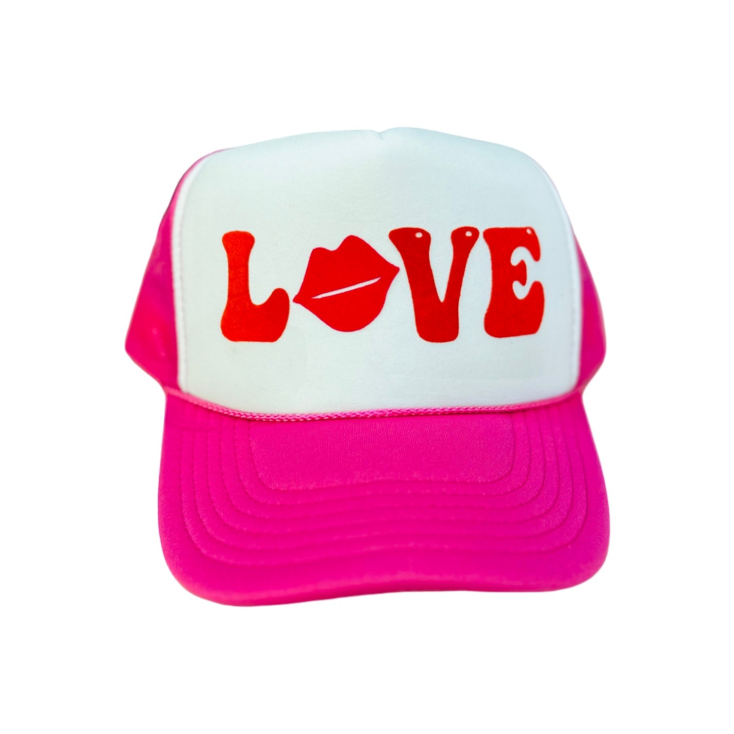 Super cute LOVE with lips design white/red trucker hat! Lips are hot pink and lettering is in red. This trucker hat is a unisex fit.