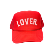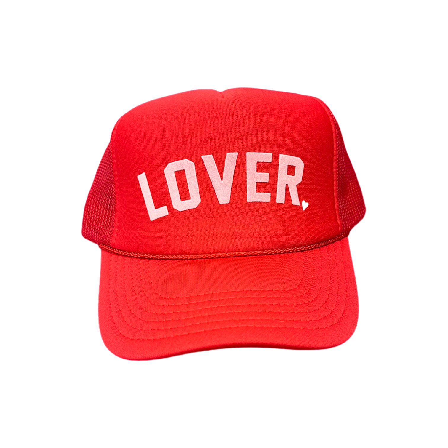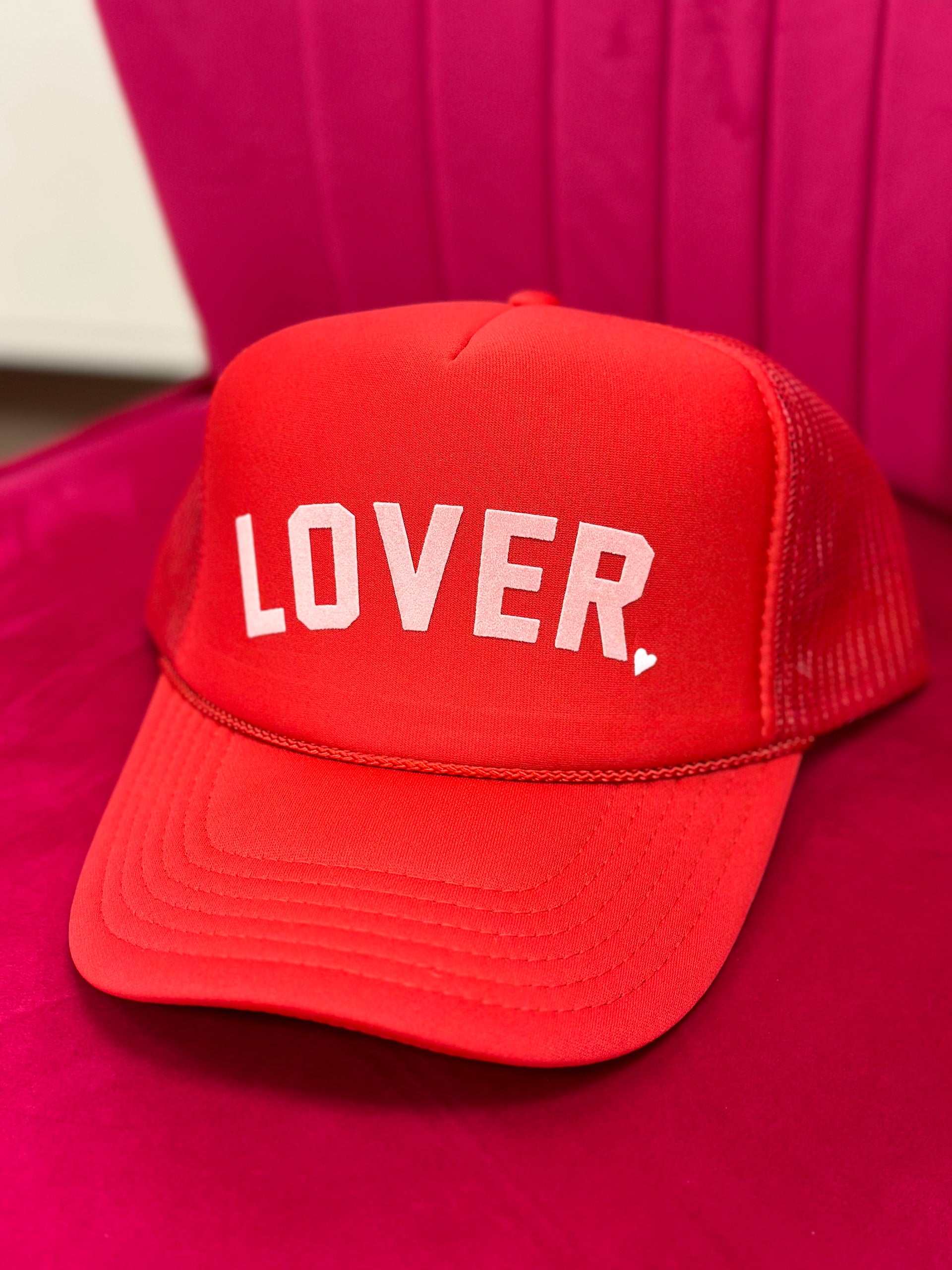 Super cute 'LOVER' red trucker hat! This trucker hat is a unisex fit.