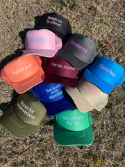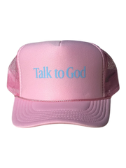 Talk to God in blue flat vinyl on light pink trucker hat. This trucker hat is a unisex fit.