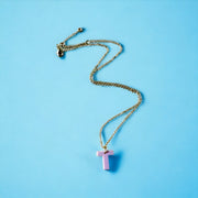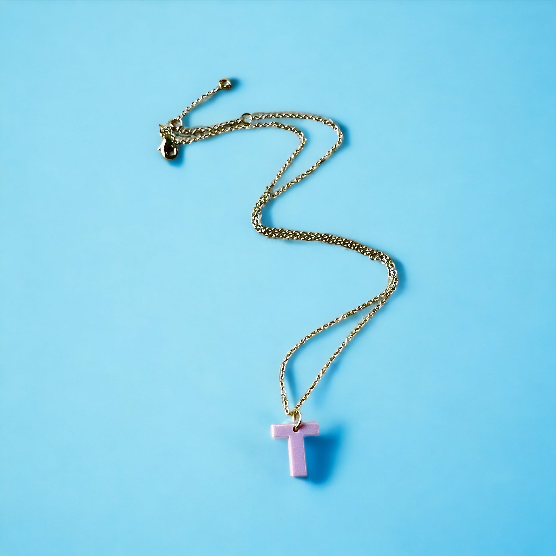 Unique hand-crafted & designed little solid pink acrylic monogram necklace on gold (16-1 inch, 1.5 mm) chain.