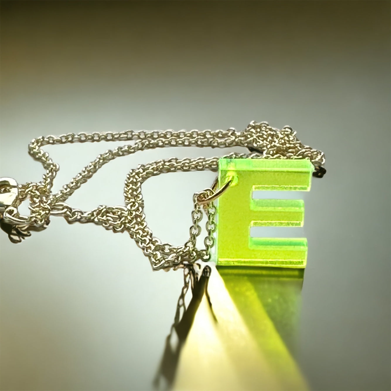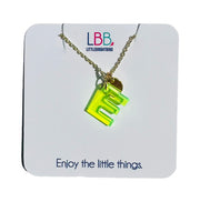 Unique hand-crafted & designed little green neon translucent lucite monogram necklace on gold (16-1 inch, 1.5 mm) chain.