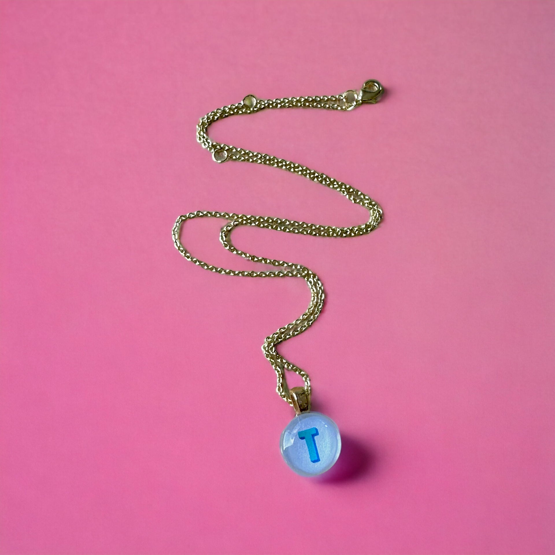 Unique hand-crafted & designed tiny round glass bauble necklace. 14mm glass bauble (about the size of a dime) on gold (16-1 inch, 1.5 mm) chain.