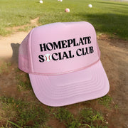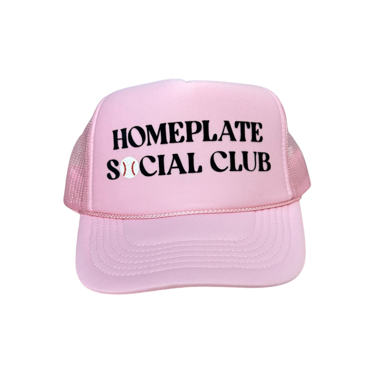 HOMEPLATE SOCIAL CLUB in black puff vinyl on light pink trucker hat! This trucker hat is a unisex fit.