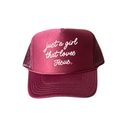 just a girl that loves Jesus in light pink velvet stripflock on maroon trucker hat! This trucker hat is a unisex fit.