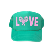 Love with tennis racquets in light pink puff on cactus green trucker hat! This trucker hat is a unisex fit.