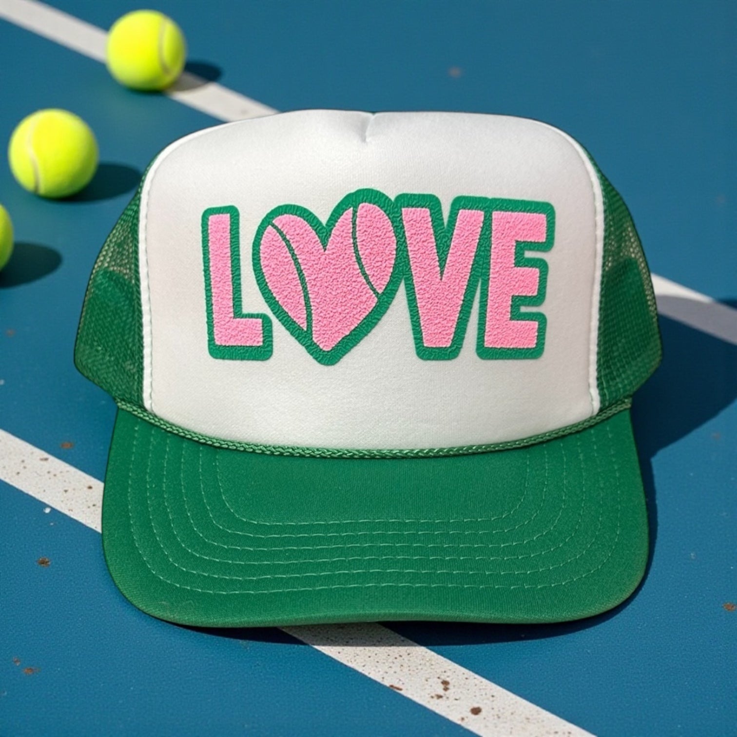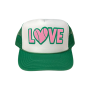 LOVE with tennis ball in double puff light pink and green white/green trucker hat. This trucker hat is a unisex fit.