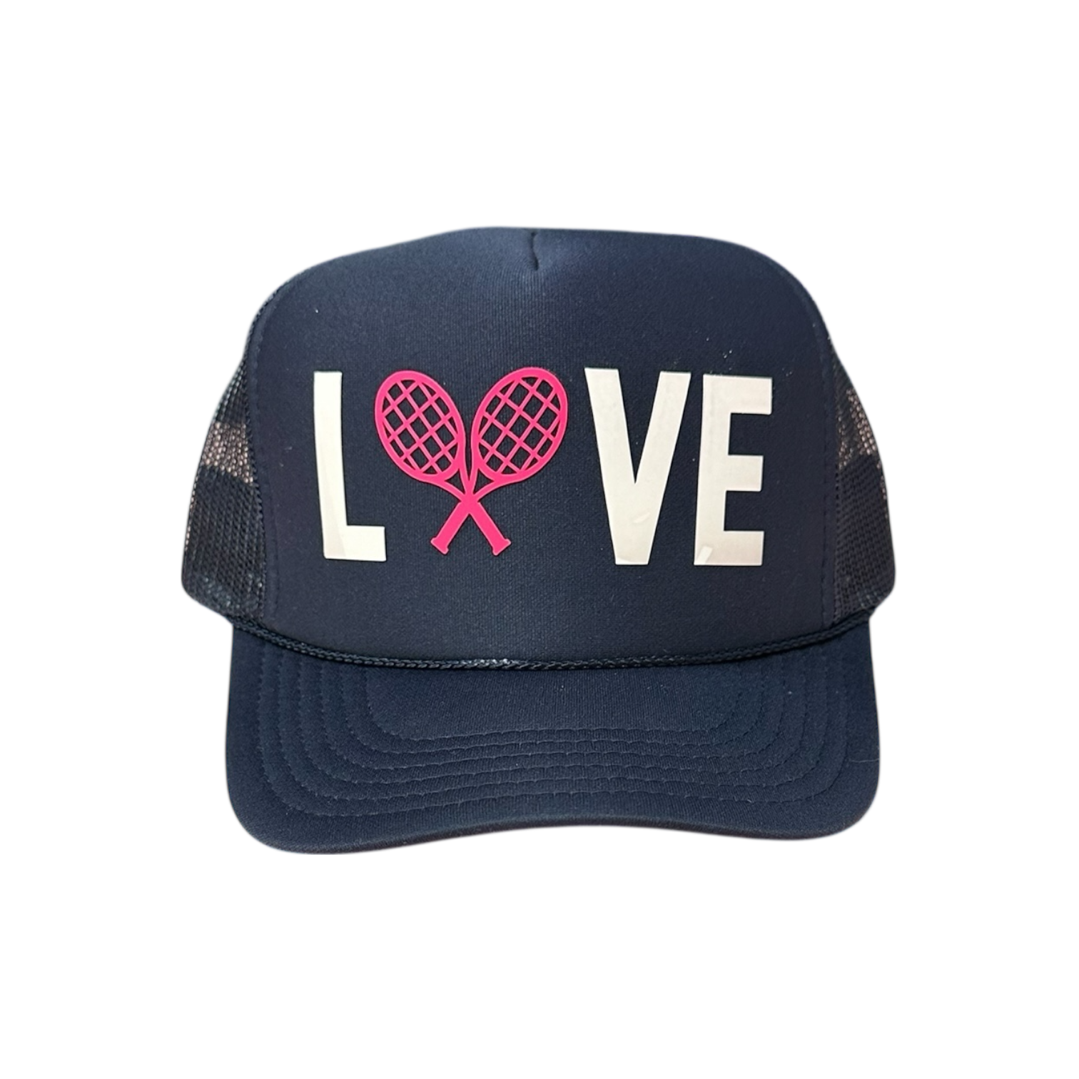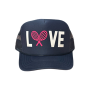 Love with tennis racquets in hot pink and white brick vinyl on navy trucker hat. This trucker hat is a unisex fit.