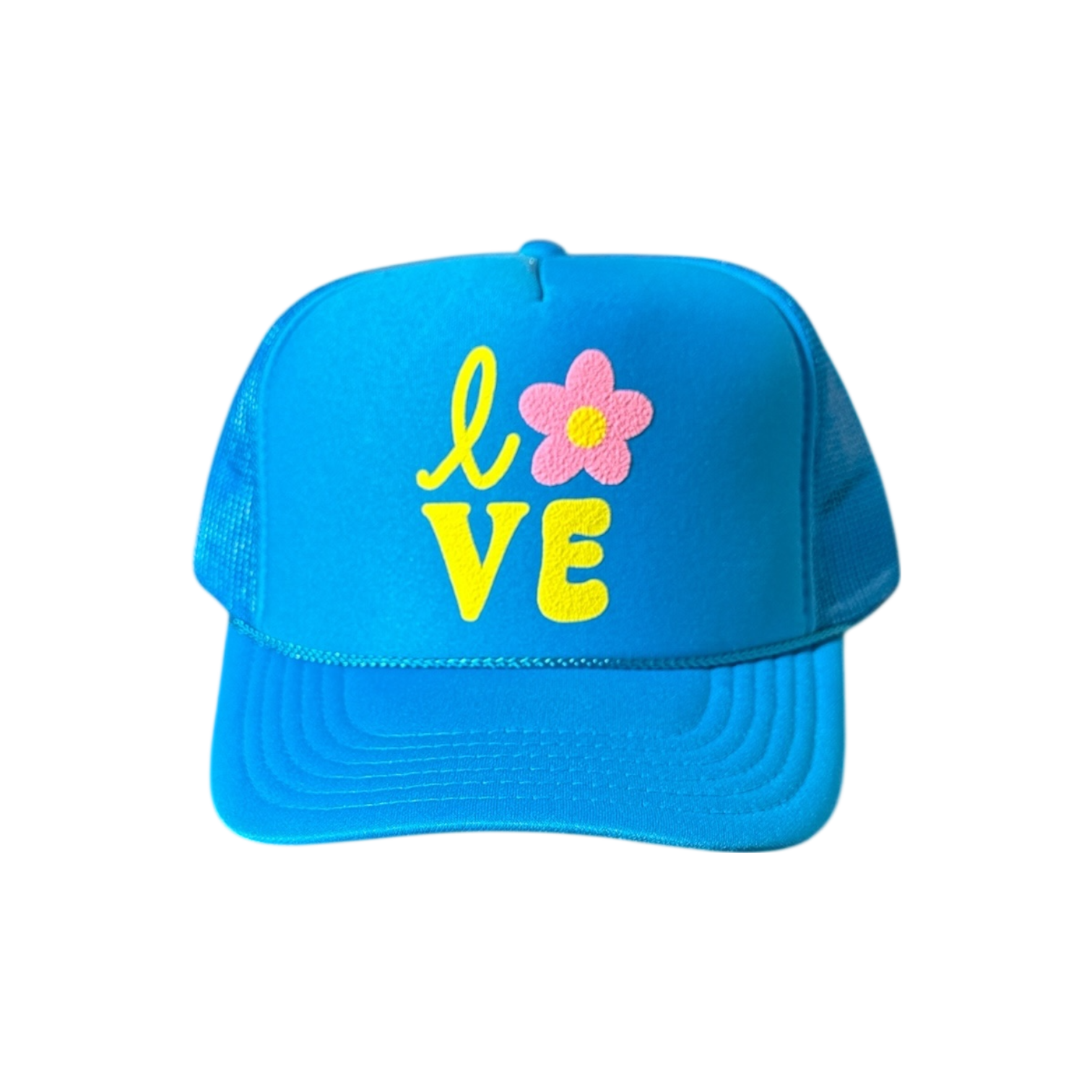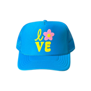LOVE with flower in yellow & light pink puff on surf blue trucker hat. This trucker hat is a unisex fit.