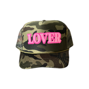LOVER in double puff (light pink and hot pink) on camo trucker hat. This trucker hat is a unisex fit.