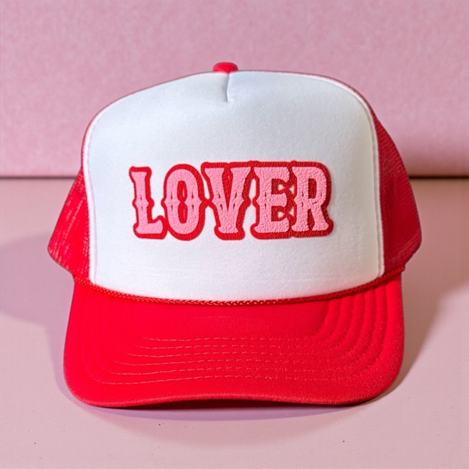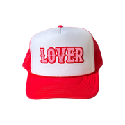 LOVER in double puff (light pink/red) on white/red trucker hat. This trucker hat is a unisex fit.