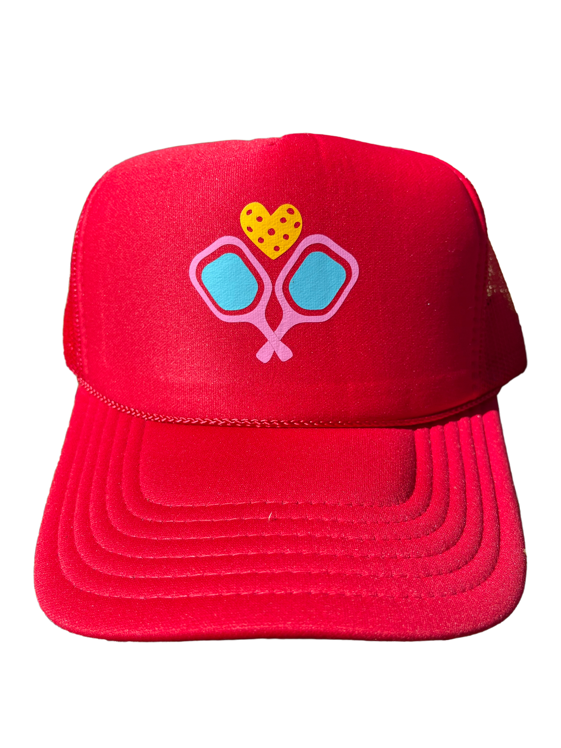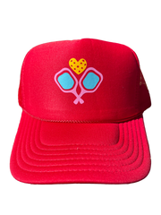 Super cute Pickleball paddle with heart ball red trucker hat! This trucker hat is a unisex fit.