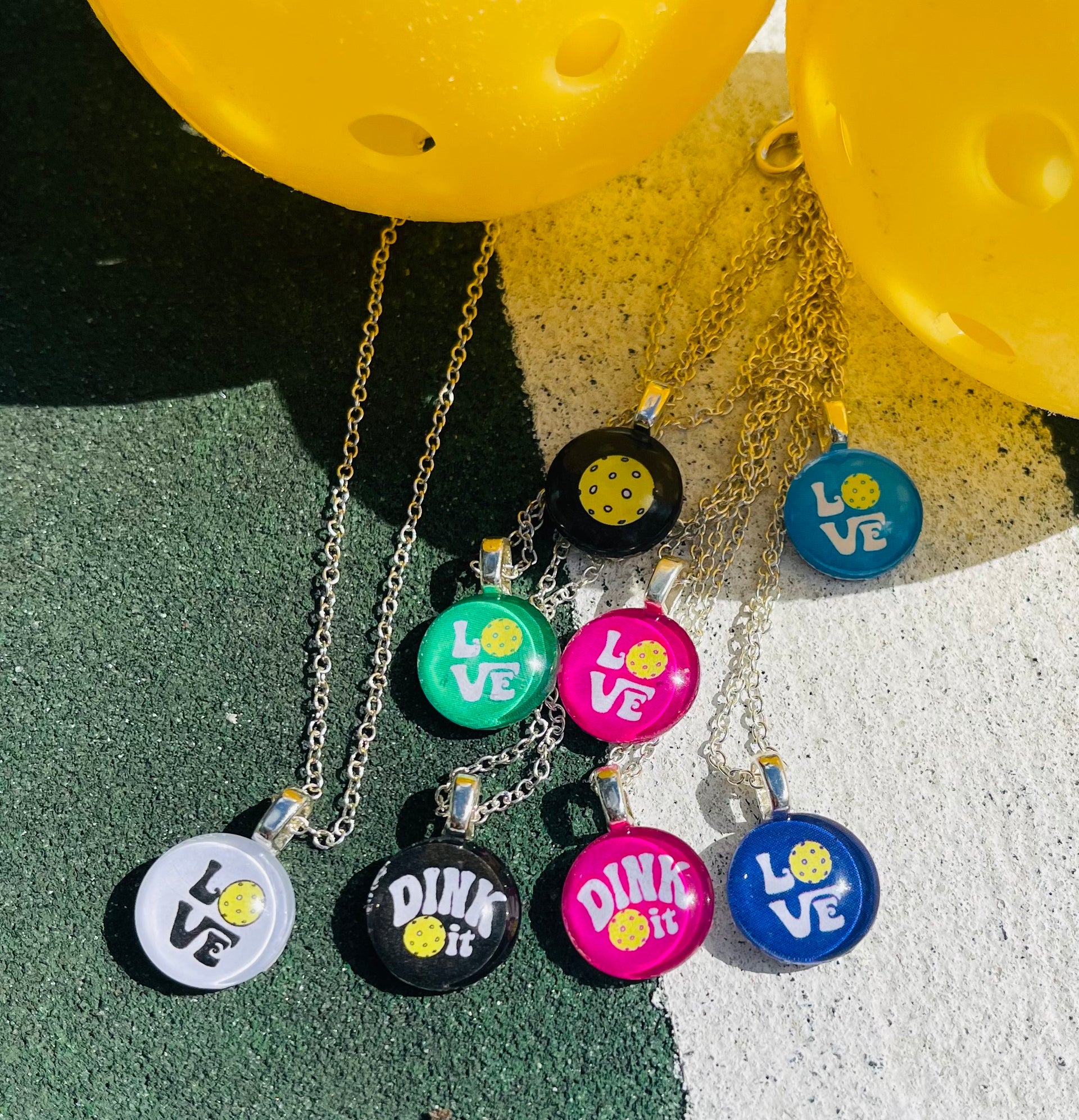 Unique hand-crafted & designed tiny round glass bauble pickleball silver necklace. 14mm glass bauble (about the size of a dime) on silverchain.