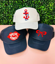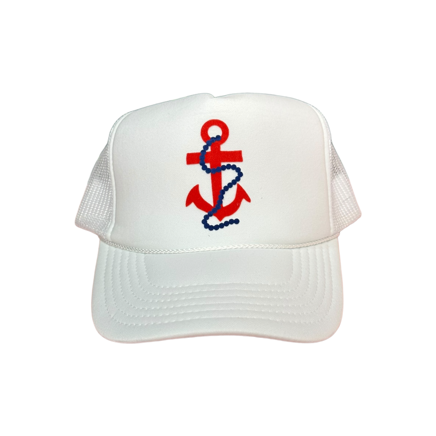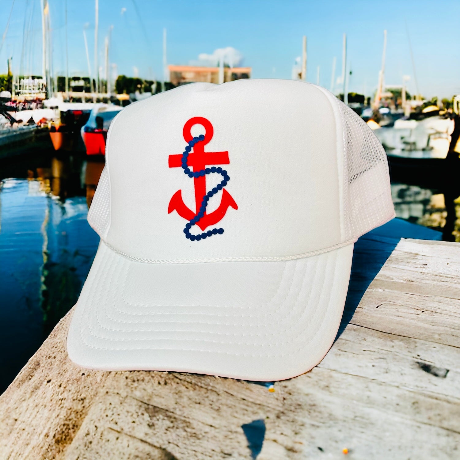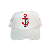 Super cute hand drawn anchor in blue/red velvet on white trucker hat! This trucker hat is a unisex fit.