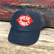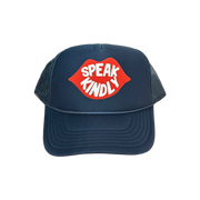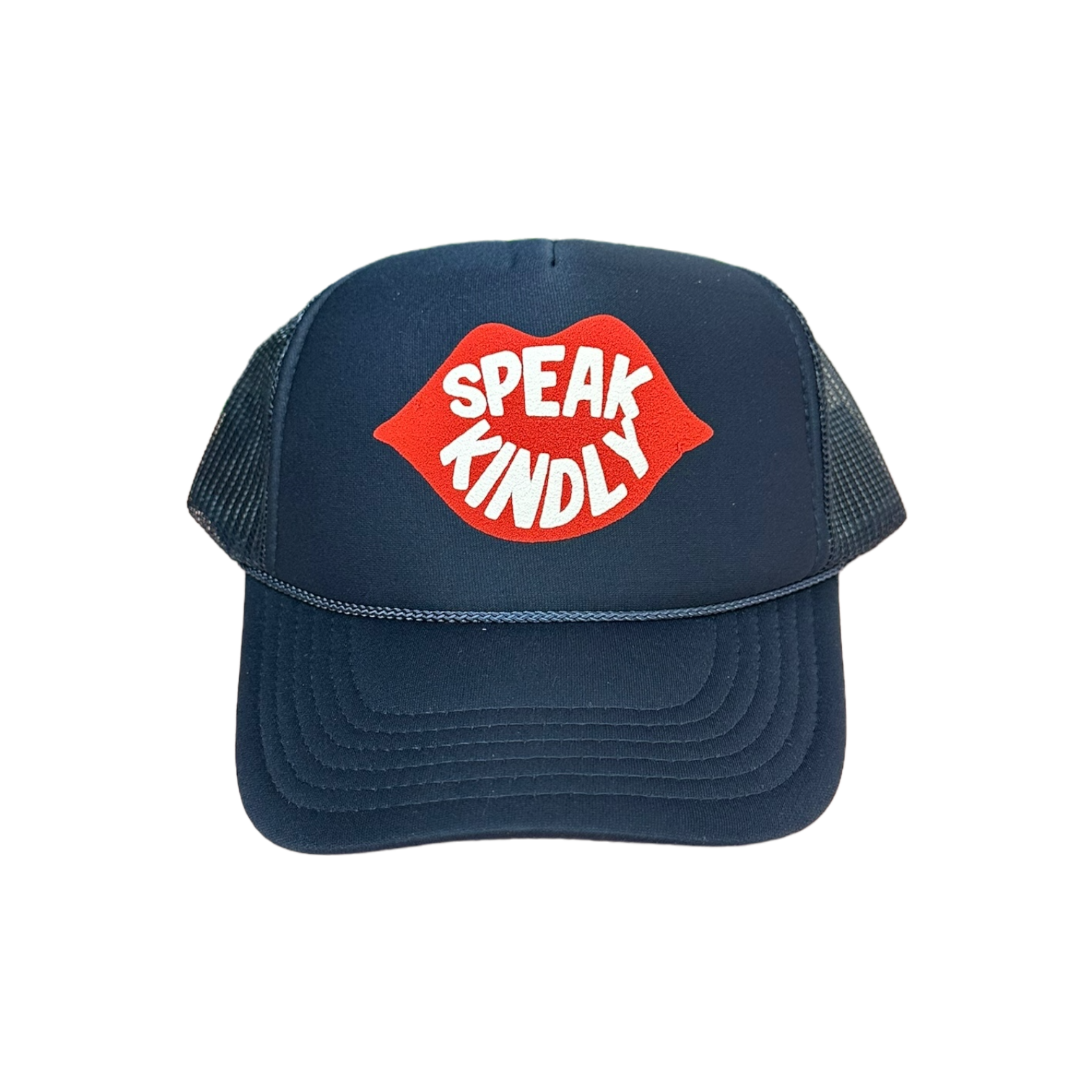 'Speak Kindly' in red/white puff vinyl on navy trucker hat! This trucker hat is a unisex fit.