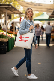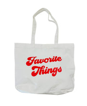 White canvas tote bag (17 x 13 x 4 inch) with 'Favorite Things' in red script design.  Super durable and good quality bag!