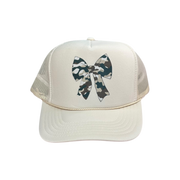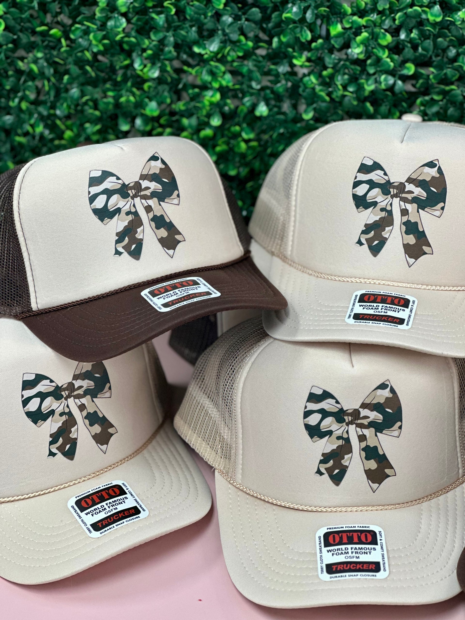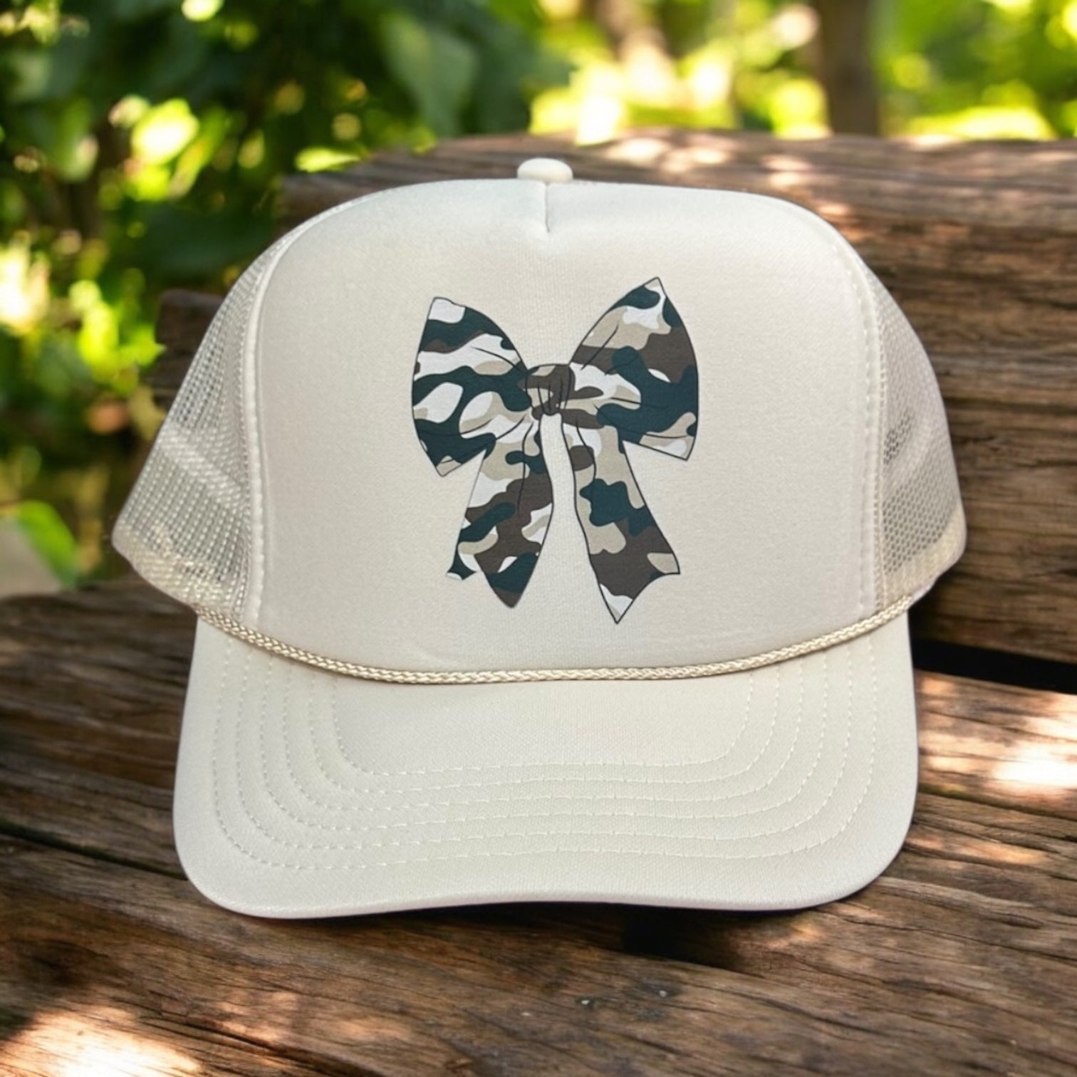 Camo Bow (hand drawn) in flat vinyl on tan trucker hat! This trucker hat is a unisex fit.