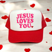 Jesus Loves You in hot pink and red vinyl on white/red trucker hat! This trucker hat is a unisex fit.
